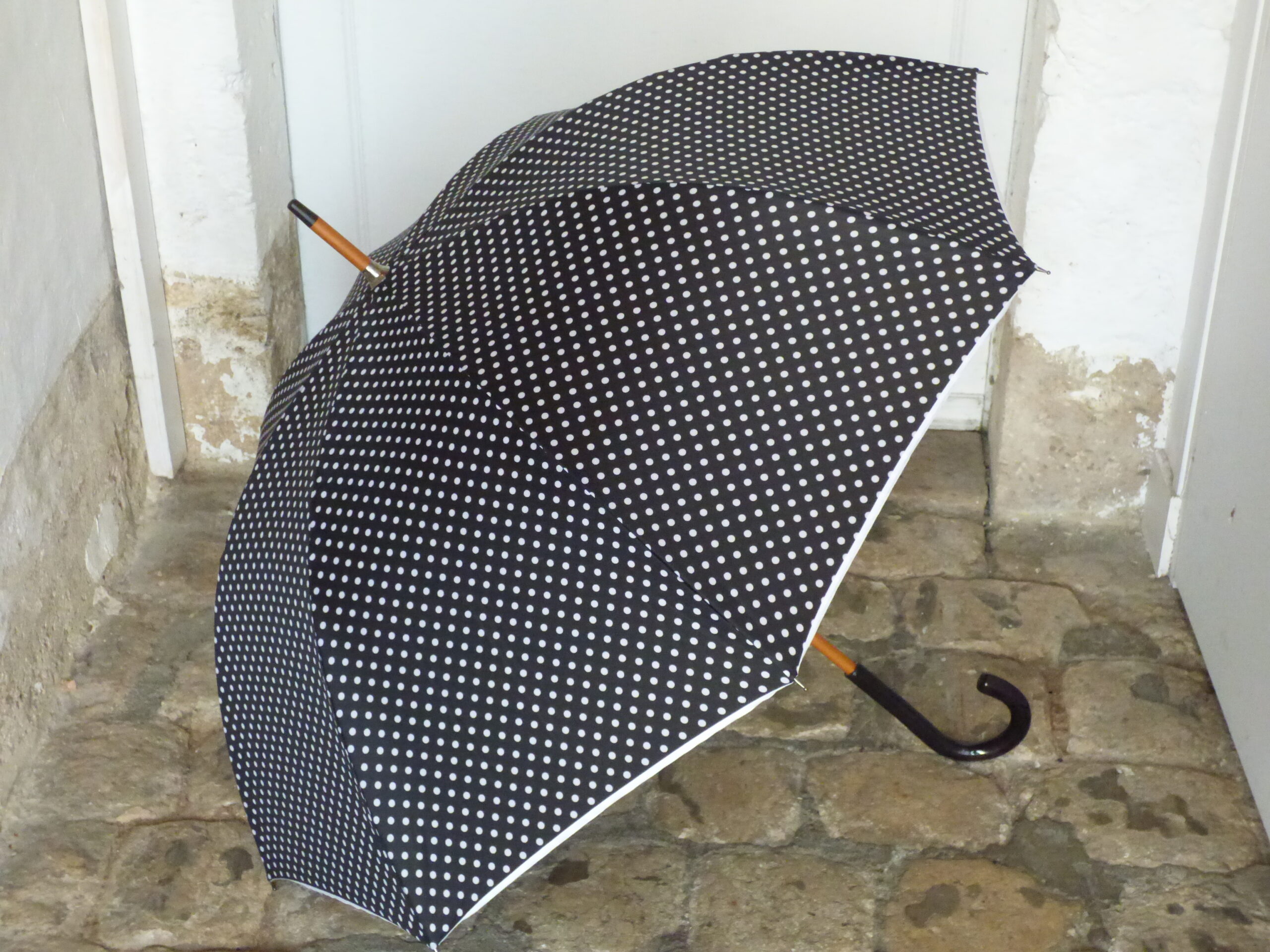 Black – White spots – White Bias86,00 € Manual « Large » umbrella Shaft : wood 8 metal canvas whales Tissue polyester or polycotton 35.4 inches closed, with handle Diameter : about 39 inches opened Weight : 1.036 lbs All our products are repairable, and the mechanisms are guaranteed. To choose your handle and / or your embroidery, click on the photo. Personalization Handle * Wood Wood Red Wood Green Wood Blue Red resin Black resin Green resin Blue resin Brown resin Bordeaux resin Wood Duck (40,00 €) Umbroidery Option + 8€ Embroidery on the closing tab - Uppercase (8,00 €) Embroidery on the closing tab - Italics (8,00 €) No Embroidery The color of the embroidery will match the color of the umbrella.Embroidery text (max 15 characters) : * (optional) Options Free gift wrapping Sheath with shoulder strap (optional) Black (16,00 €)Red (16,00 €)Navy Blue (16,00 €)Green (16,00 €)Beige (16,00 €)White (16,00 €)Bordeaux (16,00 €)None - Black - White spots - White Bias quantity + Add to basket Categories: Large 39 inches, Women's umbrella Additional information Additional information Weight 1 kg Dimensions 99 × 15 × 7 cm Coloris Black Diamètre 39 inches Type Large 39 inches Related products Sun Flower Picture – Brown and Yellow 101,00 € Details > Black White spots – Yellow 86,00 € Details > Black – Orange – Green – Butterfly Picture 101,00 € Details > Black – White spots – Red Bias 86,00 € Details >