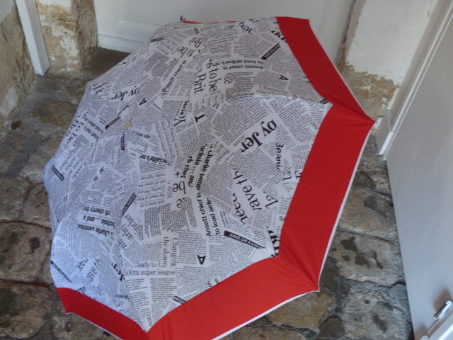Red and Newspaper83,00 € Automatic folding umbrella manual closing Metal armature with 8 canvas whales Tissue polyester 15 inches closed, with handle Diameter : about 36 inches opened Weight : 0.881 lbs Comes with cover All our products are repairable, and the mechanisms are guaranteed. To choose your handle and / or your embroidery, click on the photo. To make it easier to use, here is a video that shows you how to open and close it. Personalization Handle * Black Red Green Beech Natural Ball Exotic Wood Ball Brown Black Duck Green Duck Bordeaux Bordeaux Duck Curved Wood Curved Leather (18,00 €) Oak ball Green Blue Oak cone Beech cone Exotic wood cone Umbroidery Option + 8€ Embroidery on the closing tab - Uppercase (8,00 €) Embroidery on the closing tab - Italics (8,00 €) No Embroidery The color of the embroidery will match the color of the umbrella.Embroidery text (max 15 characters) : * (optional) Options Free gift wrapping - Red and Newspaper quantity + Add to basket Categories: Automatic folding umbrella - Diam. 36 inches, Women's umbrella Additional information Additional information Weight 0,55 kg Dimensions 48 × 13 × 6 cm Coloris Red, White Diamètre 36 inches Type Automatic folding Related products Bow tie – Black White Spots and Red Brick 83,00 € Details > Picture Butterfly – Orange, Green and Black 91,00 € Details > Picture Orchid – Purple and Black 91,00 € Details > Picture Water Drops – Blue 91,00 € Details >