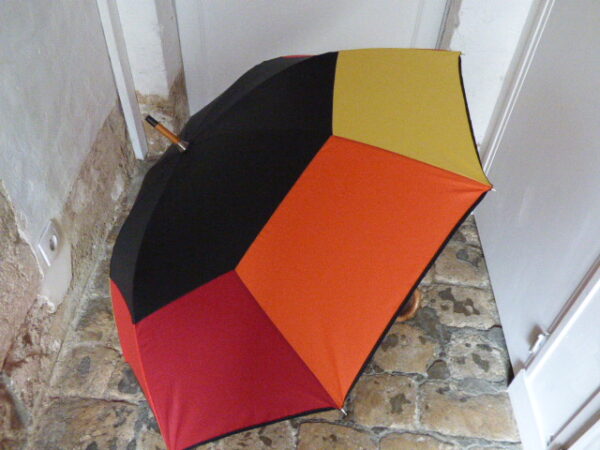 Noir – Mélange Orange, rouge et jaune103,00 € Parapluie « extra large » à ouverture manuelle Mât en bois Armature 8 baleines en métal Tissus 100 % polyester ou mélange coton/polyester selon modèles Longueur plié avec poignée 95 cm Diamètre ouvert environ 110 cm Poids 550 gr Tous nos produits sont réparables, et les mécanismes sont garantis. Pour choisir votre poignée et/ou votre broderie, cliquez sur la photo. Personnalisation Votre poignée * Courbe bois noire Courbe bois Bordeaux Courbe bois Verte Courbe bois Bleue Poignée bois foncé Bois clair Broderie (Option(s) + 8€) Broderie sur la patte de fermeture - Majuscule (8,00 €) Broderie sur la patte - Italique (8,00 €) Aucune broderie La couleur de la broderie sera assortie à la couleur du parapluie. Texte de la broderie (15 caractères max) * (facultatif) Options Emballage cadeau offert Choix de la housse (facultatif) Noire (16,00 €)Rouge (16,00 €)Bleu Marine (16,00 €)Vert Anglais (16,00 €)Beige (16,00 €)Blanc (16,00 €)Bordeaux (16,00 €)Pas de housse - quantité de Noir - Mélange Orange, rouge et jaune + Ajouter au panier Catégories : Parapluie canne extra large - Diam. 110 cm, Parapluie femme Informations complémentaires Informations complémentaires Poids 0,9 kg Dimensions 99 × 16 × 10 cm Coloris Multicolore, Noir Diamètre 110 cm Type Parapluie extra large 110 CM Produits similaires Damier Noir et Journal 103,00 € Détails > Damier Rouge et Journal 103,00 € Détails > Bordeaux avec tape à terre en métal 103,00 € Détails > Damier Noir et Multicolore 103,00 € Détails >